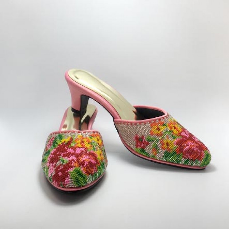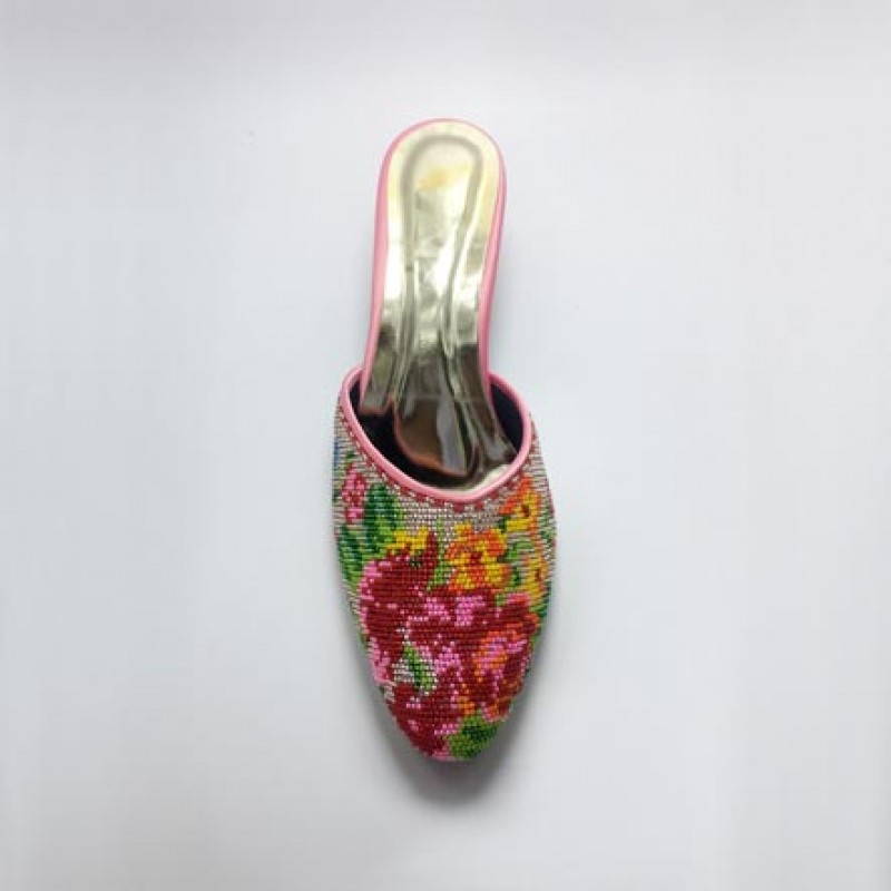 The materials used include Silk cloth, thread and multi coloured glass beads.